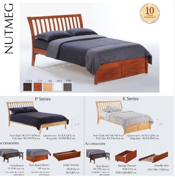 • Universal Bed Rails come with our patented Thumnut™ for easy assembly of legs and rails. • Our Beds come complete with 10 pcs of 4″ mattress support slats, and supported down the center with our rail and foot support system. • Our beds come with a variety of useful and attractive accessories including our patent-pending Folding Footboard Bench as an option. • Our models are beautifully finished with automated and hand-rubbed techniques for a rich and durable finish. • We use solid Eco-friendly plantation-grown hardwood throughout the Spices Collection as our primary construction material. • Clear, completely illustrated assembly instructions. • 10-year limited warranty. • Available in US size Twin, Full, Queen, Eastern King • Five different finishes for most of the styles
