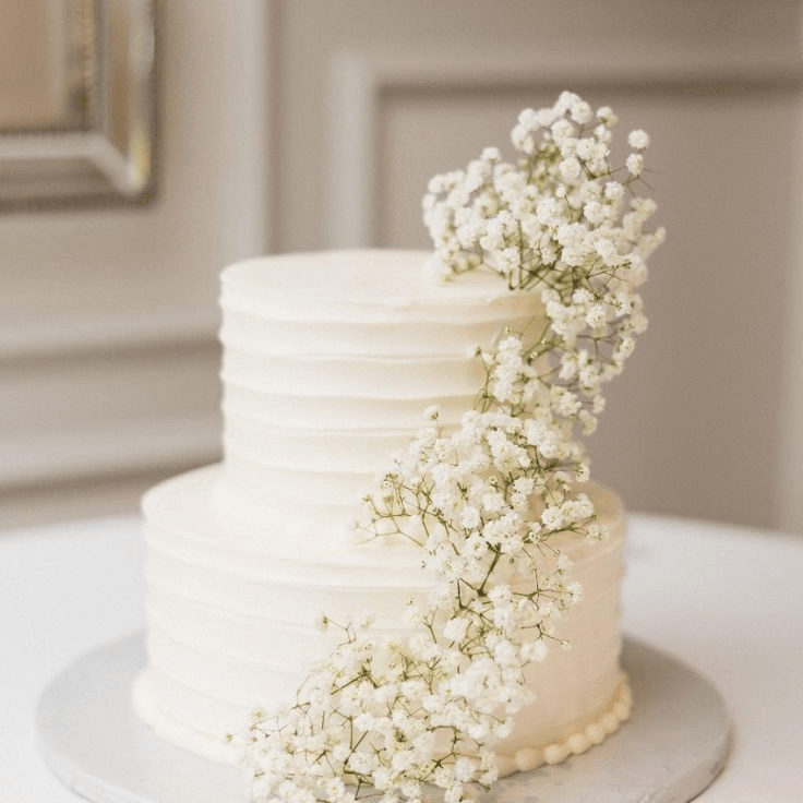 Two layers of yellow sponge cake, filled with a delicious mixture of white chocolate, whipped cream & fresh egg whites. Topped with white chocolate shavings.