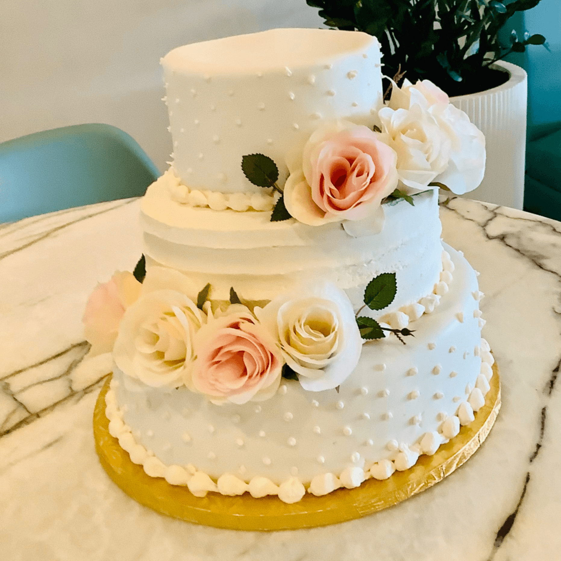 Three layers of chocolate cake layered with vanilla buttercream and vanilla icing.