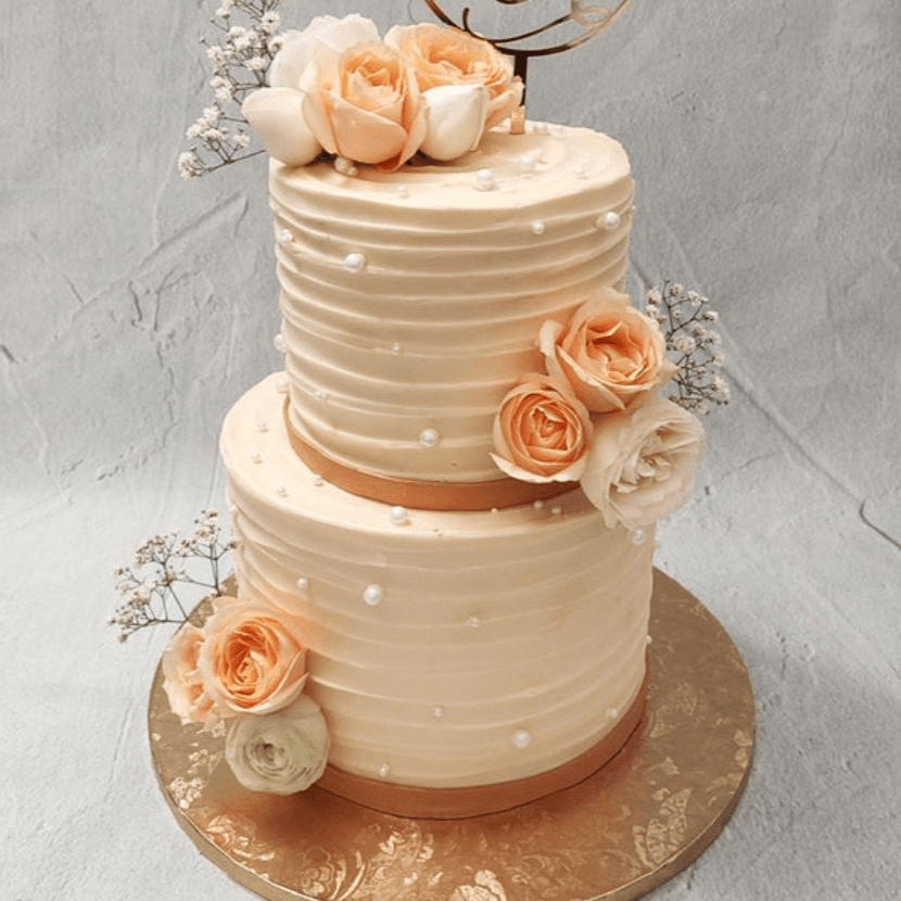 Vanilla buttercream filling on three layers of yellow sponge cake.