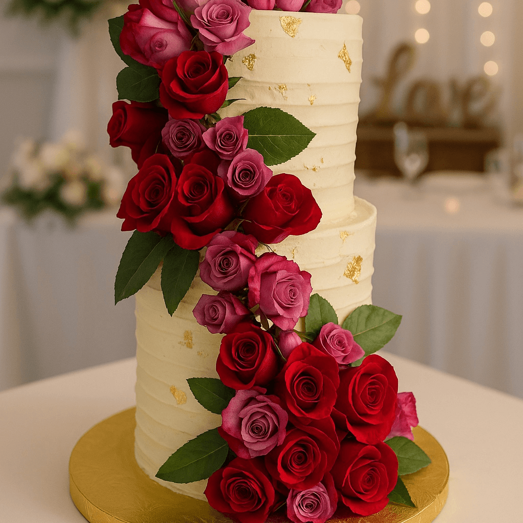 Three layers of rich vanilla punch soaked devils food cake, layered with luscious cream filling made from dark chocolate and heavy cream. Decorated with chocolate dipped strawberries.