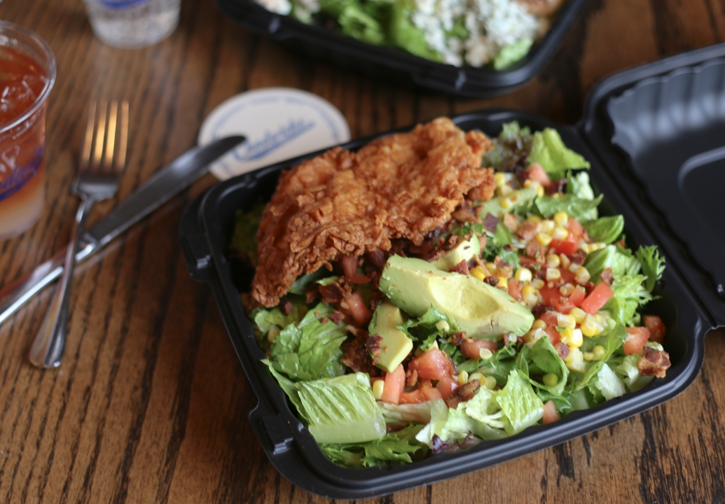 Buttermilk fried chicken, bacon, avocado, roasted corn, tomato, ranch, mixed greens