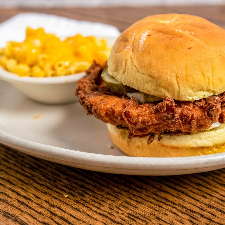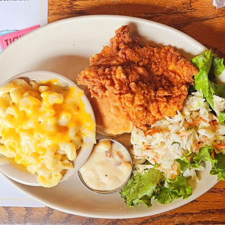 Fried Chicken breast, bacon gravy, mac & cheese, coleslaw