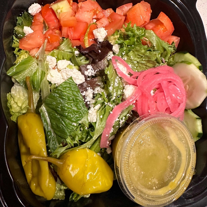 Mixed Greens, Kalamata Olives, Feta Cheese, Tomatoes, Cucumbers, Pepperoncini, Pickled Red Onion, Herb Vinaigrette Dressing