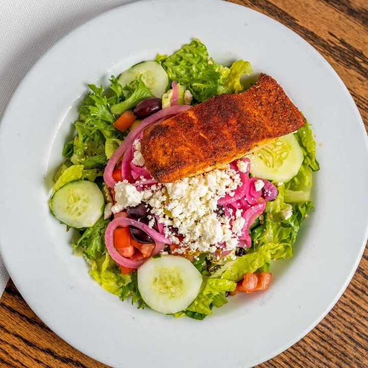 Blackened Salmon, Mixed Greens, Kalamata Olives, Feta Cheese, Tomatoes, Cucumbers, Pepperoncini, Pickled Red Onion, Herb Vinaigrette Dressing
