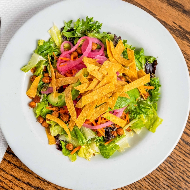 Spiced chickpeas, pickled red onions, carrots, avocado, tortilla crisps, gonzo dressing (vegan)
