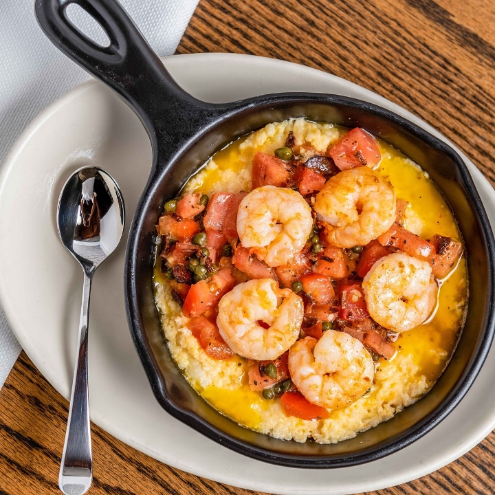Jumbo shrimp sauteed in butter with bacon, tomatoes, capers and served with cheddar cheese grits